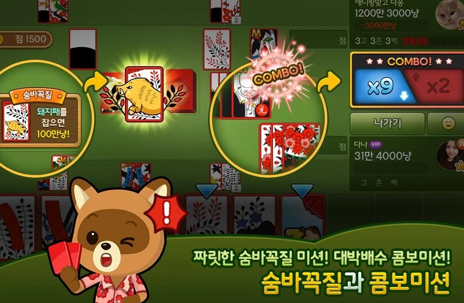 애니팡 맞고에서는 고스톱뿐만 아니라 게임 메인화면에서 놀이터로 갈 수 있는데, 놀이터에서는 화투 룰렛을 돌려 다양한 게임 보너스를 받을 수 있고, 친구에게 화투패를 받아 대박 머니 찬스를 노려볼 수도 있습니다. 부담 없이 할 수 있는 보너스 대전과 높은 배수의 미션이 터지는 애니팡 대전도 즐길 수 있습니다.