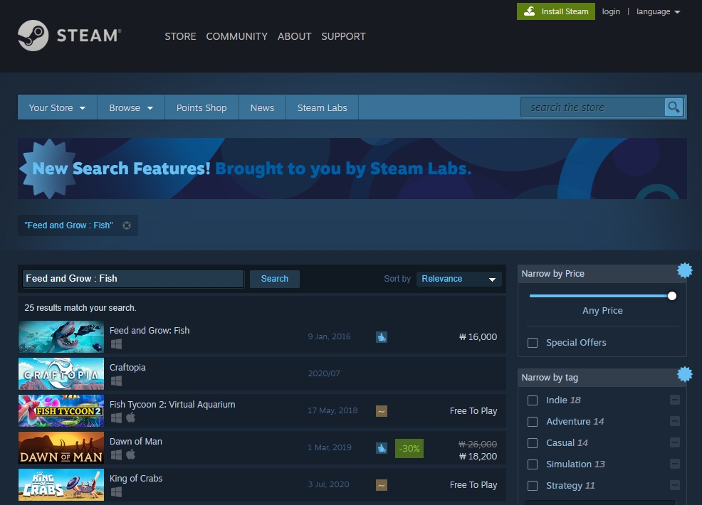 피드 앤 그로우 피쉬 게임(Feed and Grow : Fish)을 다운로드하기 위해서는 '스팀(Steam)'이라는 사이트에 접속해야 합니다. 네이버에서 스팀이라고 검색하면 아래와 같이 사이트 주소가 나옵니다. 클릭하시고 들어가면 제일 우측 상담에 검색하는 곳이 나옵니다. 이곳에 'Feed and Grow : Fish'을 입력하면 게임을 다운로드할 수 있는 링크가 나옵니다.